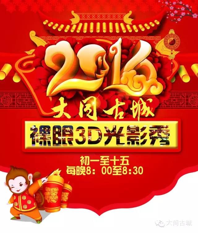 2016春節(jié)期間,由大同市城區(qū)區(qū)委、區(qū)政府和古城管委會籌備組主辦的大型3D裸眼燈光秀將在古城西城墻廣場上演,為古城增添一道靚麗的夜景。