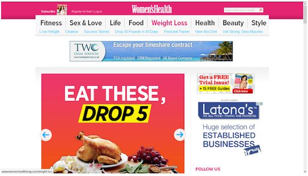 下圖是女性健康雜志的頁面,上面的Banner使用了粉紅色,導(dǎo)航設(shè)計更為大膽,除此以外網(wǎng)站其他的地方用色倒并不豐富。不得不說這樣的選擇非常有趣。