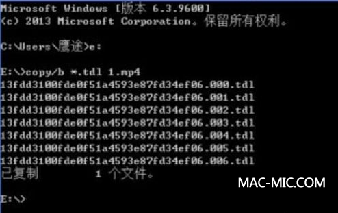 然后使用WIN圖標鍵+R ,打開cmd ,輸入 e: 按下回車進入e盤 ,然后輸入:copy/b *.tdl 1.mp4 對E盤下所有tdl格式的文件進行合并。