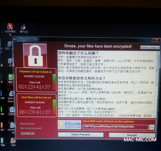 勒索病毒會(huì)把磁盤里的圖片、文檔、視頻、壓縮包等各類資料強(qiáng)行加密,導(dǎo)致文件無法正常打開。此次爆發(fā)的勒索病毒包括ONION和WNCRY兩種,分別會(huì)把磁盤文件篡改為.onion和.wncry后綴,病毒敲詐的金額高達(dá)5萬多元。